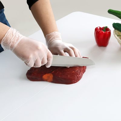 Vinyl In the food service industry, as more and more workers wear gloves during preparation tasks, the use of vinyl gloves is growing rapidly. It does not contain latex and has a smooth surface. Although the size appears to be looser than nitrile or latex gloves, it still fits the hand better. This kind of gloves can also be used in other industries including medical treatment and cleaning.